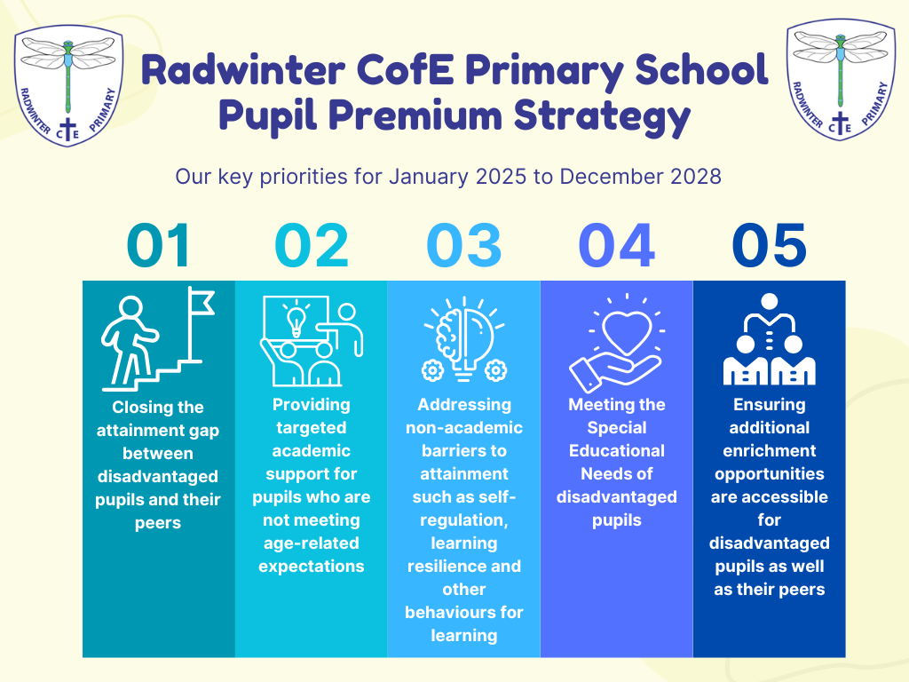 Research shows that the most effective way to reduce inequalities resulting from socio-economic factors is by investing in high-quality, inclusive class teaching, and we believe that setting appropriate learning goals, giving children well-executed, differentiated lessons and constructive feedback, and having high expectations for all pupils, regardless of their personal circumstances, will narrow such an attainment gap. We believe in maximising the use of the pupil premium grant (PPG) by utilising a long-term strategy aligned to the SDP. This enables us to implement a blend of short, medium and long-term interventions, and align pupil premium use with wider school improvements and improving readiness to learn. We also recognise that, in some cases, targeting resources to provide tailored interventions for individuals or groups of children to help them overcome their particular barriers to learning will have a positive impact on learning and achievement, and we recognise, celebrate and build on children’s strengths, to further boost confidence. Overcoming barriers to learning is at the heart of our strategy plan. We understand that needs and costs will differ depending on the barriers to learning being addressed. As such, we do not automatically allocate personal budgets per pupil in receipt of pupil premium funding. Instead, we identify the barriers to be addressed and the interventions required, whether in small groups, large groups, for the whole school or as individuals, and allocate resources accordingly. We aim to help every child at Radwinter CofE Primary School achieve their full potential, and every child’s progress is closely monitored and analysed by staff and governors. Specific data about the attainment of children in receipt of pupil premium funding is looked at separately, along with feedback from children, staff and parents, so that we can identify what is working well and where further support is needed. Setting priorities is key to maximising the use of the PPG. Our priorities are as follows: 1. Closing the attainment gap between disadvantaged pupils and their peers 2. Providing targeted academic support for pupils who are not meeting age-related expectations 3. Addressing non-academic barriers to attainment such as self-regulation, learning resilience and other behaviours for learning 4. Meeting the Special Educational Needs of disadvantaged pupils 5. Ensuring additional enrichment opportunities are accessible for disadvantaged pupils as well as their peers |